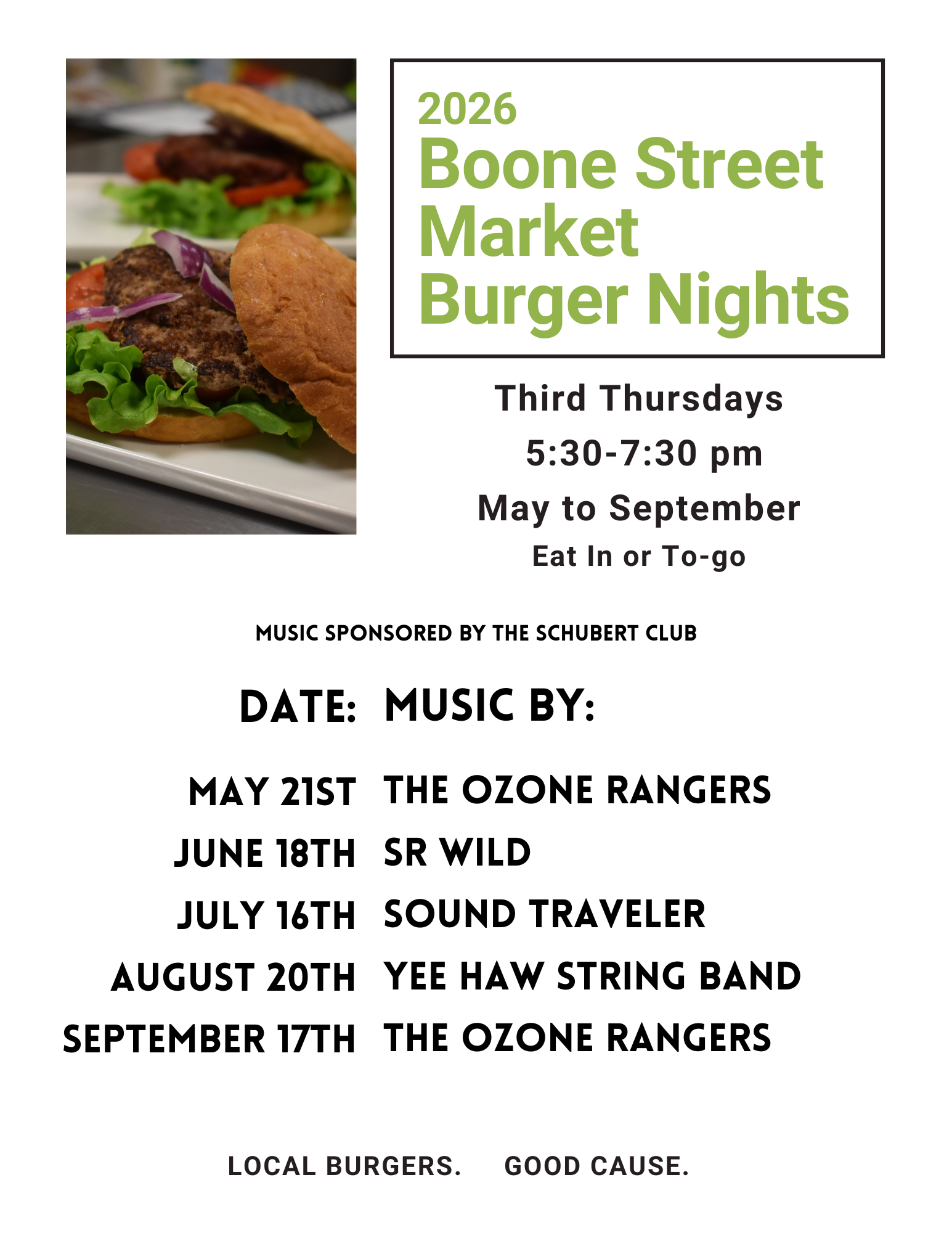 Boone Street Market Burger Nights happen on the third Thursday of the month from May to September from 5:30 to 7:30 pm. They feature locally-sourced beef burgers, house-made veggie burgers, and third burger patty (or something new!) that changes each month. Boone Street Market itself will be open until 7:30 pm, so you can shop for your groceries and any snacks or desserts to go with your burger.